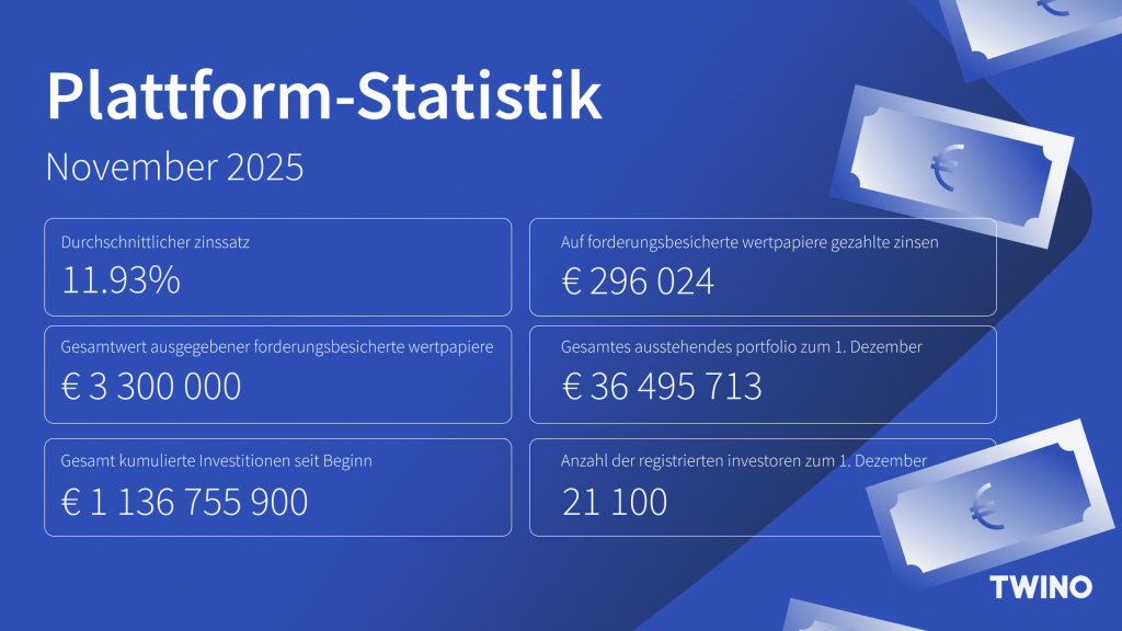 TWINO-Update: November Dezember 2, 2025 / Posted byTWINO Nachfolgend finden Sie die wichtigsten Zahlen und Plattformentwicklungen vom November 2025. Update zu den kriegsbetroffenen Krediten. Bitte sehen Sie sich die neueste Zusammenfassung unten an: TWINO TWINO news TWINO updates and news, including monthly investor updates, changes in company, new product and market updates. Weitere Beiträge anzeigen TWINO TWINO news TWINO updates and news, including monthly investor updates, changes in company, new product and market updates. Weitere Beiträge anzeigen